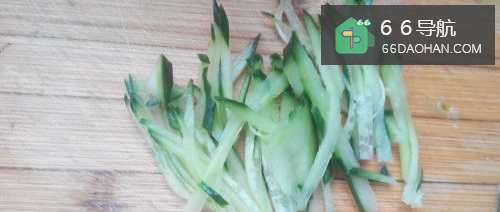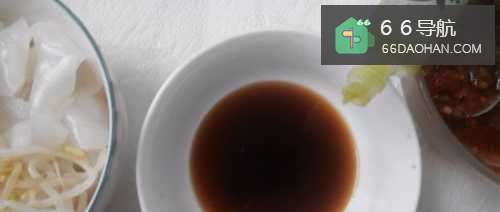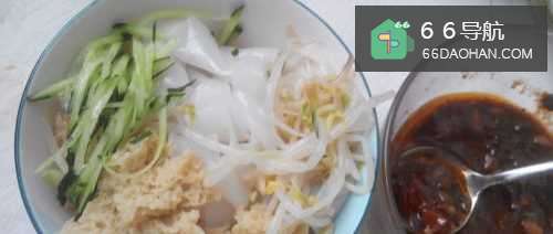 8将冰箱中的凉皮取出,放上面筋、黄瓜丝、绿豆芽,浇上调制好的料汁。