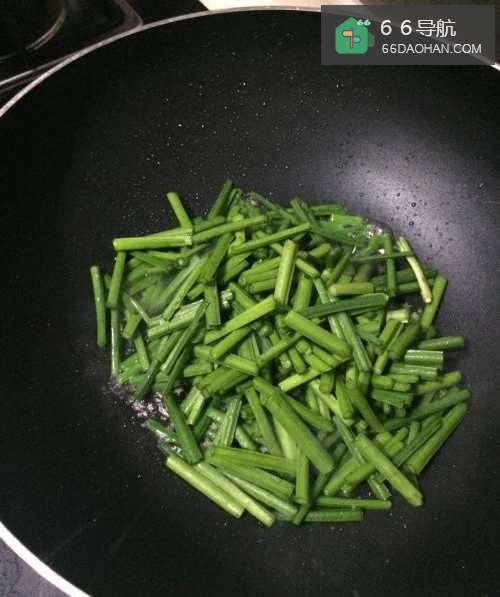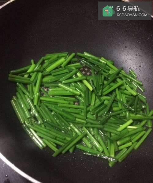 7韭菜苗炒至变色后加入炒好的蛋块;