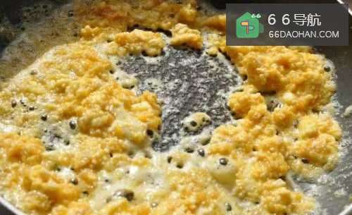 3锅中放入2大匙热油,将碎咸蛋黄放入锅中煸至起泡。