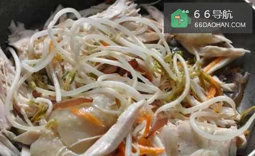 2热油,将木耳丝、杏鲍菇丝、红萝卜丝下锅拌炒,接着放入豆芽菜与鸡丝拌一下起锅备用。