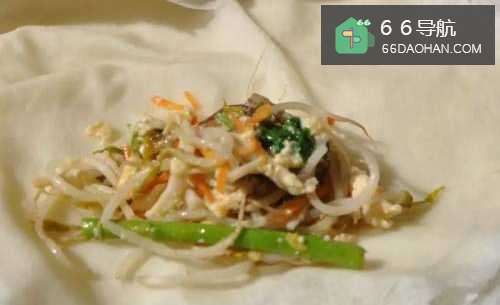 5准备春卷皮,放入适量的炒好的内馅料包覆卷起。