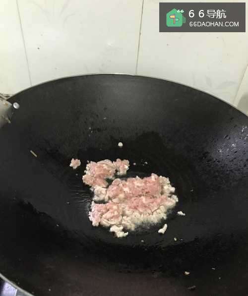 4炒锅放油,把蒜米放入爆香,倒入猪肉翻炒熟。