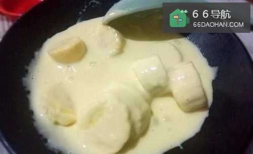 3把香蕉段放在调好的面糊中,使香蕉表面裹满面糊