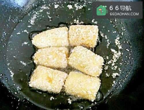 5将裹满面糊的香蕉放入油锅中慢慢的炸制,当香蕉表面的面糊呈金黄色时,捞出摆盘就可以了。