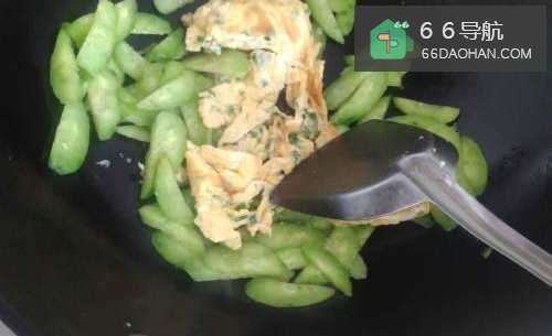 6炒到黄瓜颜色加深,加入第四步炒好的鸡蛋翻炒,如图