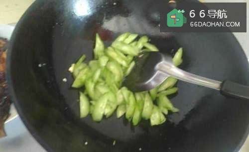 5油锅中剩余的油炒黄瓜片,加入少量盐,逼出黄瓜内的水分,如图
