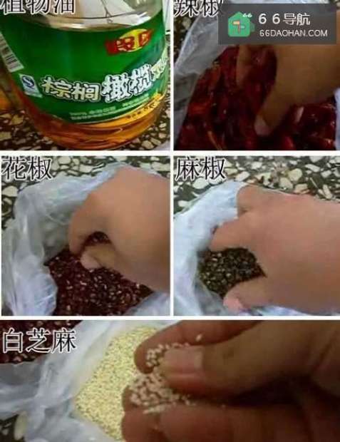 辅料有花椒、麻椒和白芝麻。