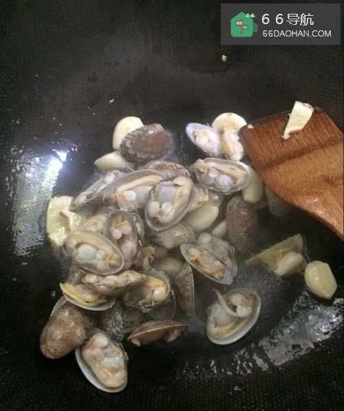 2锅里放水放花甲煮开后,用锅铲翻动,花甲壳子立刻打开。