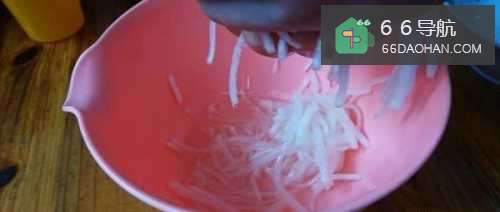 首先,我们把白萝卜去皮切丝,最好不要用擦丝的方法,如果你觉得自己刀工不好,切粗一点也没有关系的。