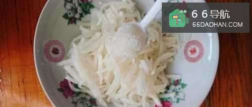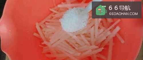 2切好的萝卜丝放在一个容器内,撒上3料勺的食盐,并搅拌均匀腌制30分钟,放盐腌制的作用主要是给萝卜杀一下水,这样做出来的成品才会口感爽脆,而且也不会有生萝卜的辣味,所以这是一道必不可少的工序。