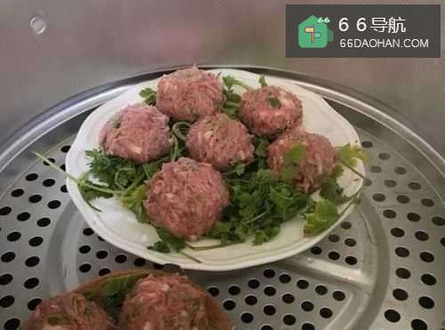 8手沾水把肉陷挤成一粒一粒放在铺好香菜的盘子再放蒸锅里盖上,大火蒸8分钟。