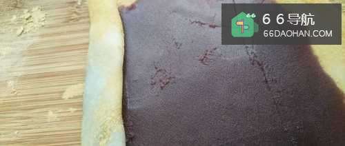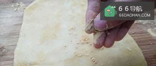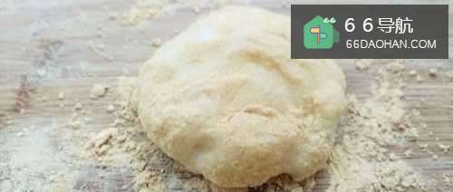 5粉团在黄豆粉里滚一滚,然后用擀面杖擀成长的面片。