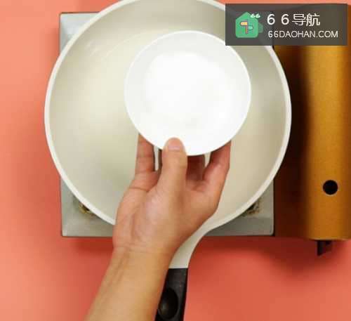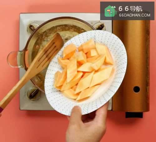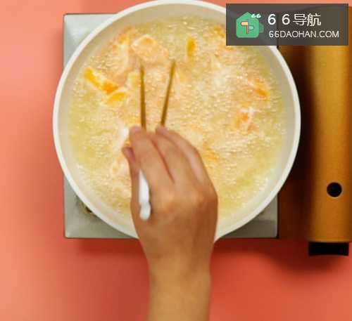 5这时候,我们往锅中放入白砂糖,小火熬至糖浆;