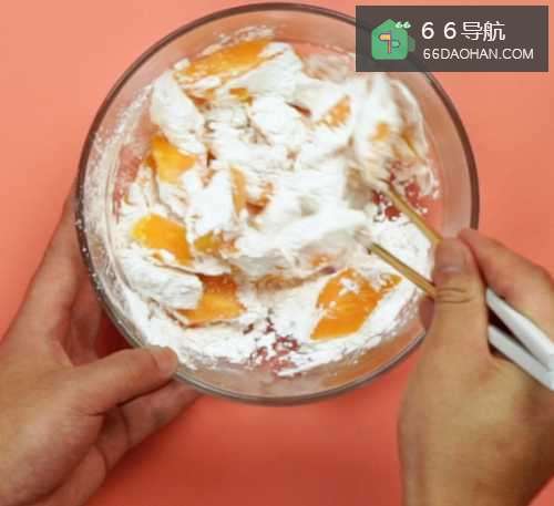 3然后将地瓜倒入碗中,放入淀粉,搅拌均匀;