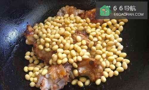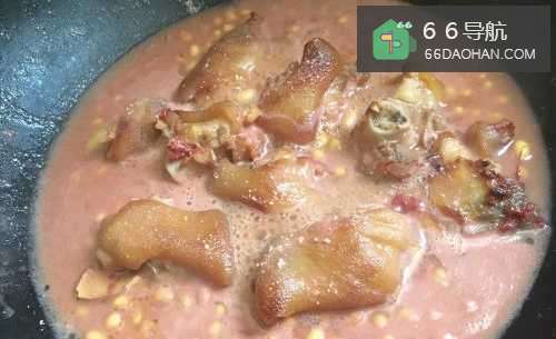 5紧接着把沥干水分的黄豆倒进去翻炒,翻炒2分钟后就可以把红腐乳水倒进去,水量以快没过猪蹄为准,开大火烧开!
