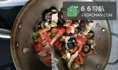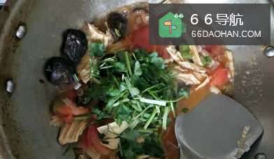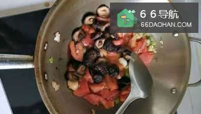 4油烧热,把葱放入锅中炒出葱香,然后倒入番茄,适量盐,炒出汁,放入香菇。