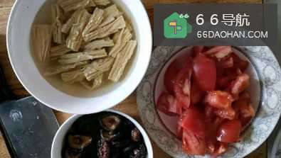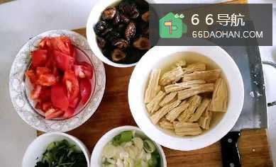 3小葱洗净切成小段,香菜切成小段,番茄,香菇,腐竹装在小碗备用。