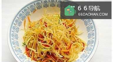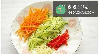 2黄瓜切丝、胡萝卜切丝、红椒切丝、青椒切丝、蒜子切成蒜米。