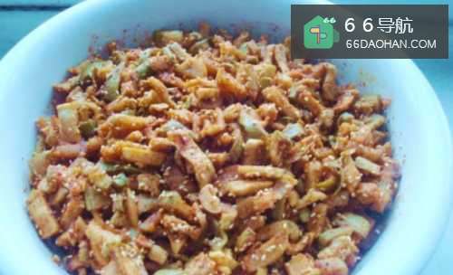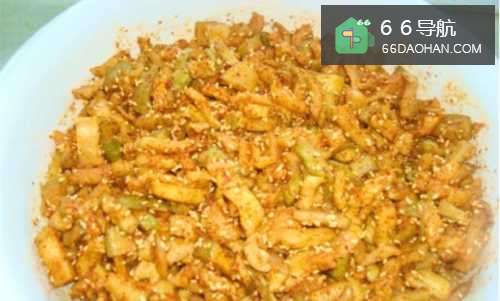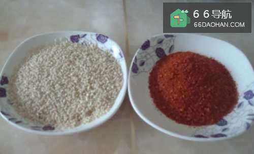 7把清油烧热然后泼在芝麻椒面上,再跟腌制的萝卜条搅拌均匀。
