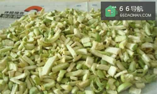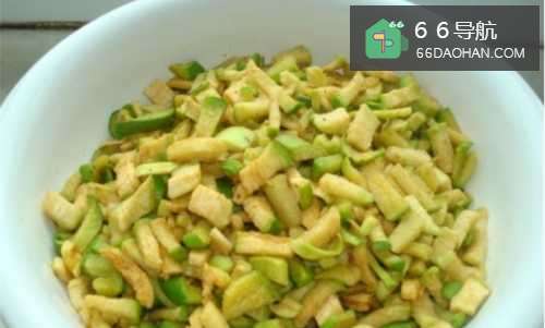 3青萝卜去根须,切成5 * 1 cm长度的萝卜条,然后晾晒至8成干。