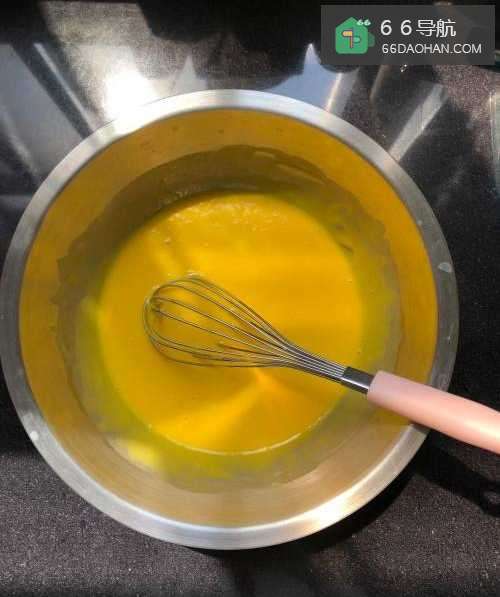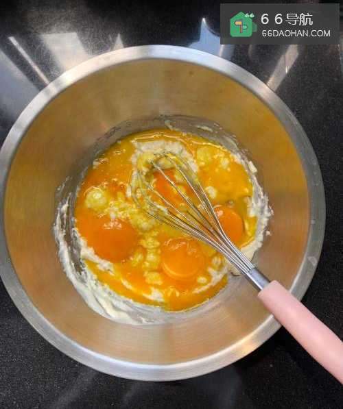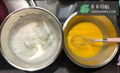 7打发蛋白,中途把细砂糖分三次倒进蛋白进行打发,打发至提起打蛋器出现小弯钩即可