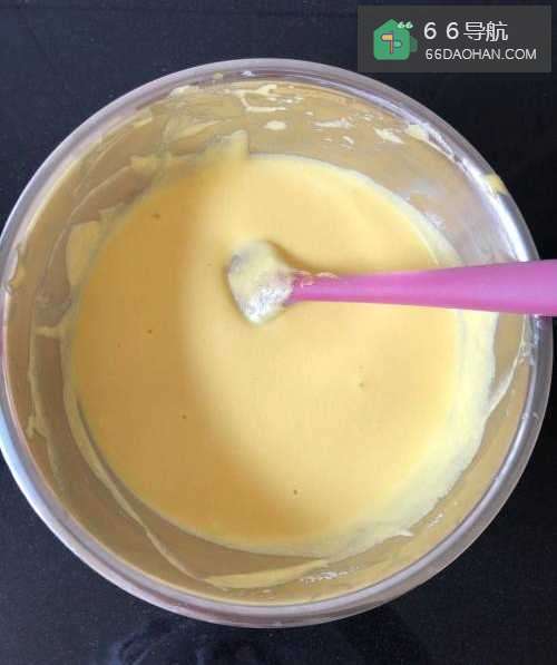 8取1/3蛋白霜倒进面糊,切拌均匀后倒进剩下的蛋白霜里继续切拌均匀