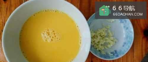 2鸡蛋磕碎在碗里,并放一点盐搅拌均匀,蒜头切碎备用。