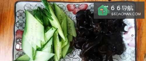 黄瓜洗净切菱形片,泡发好的木耳撕小朵。