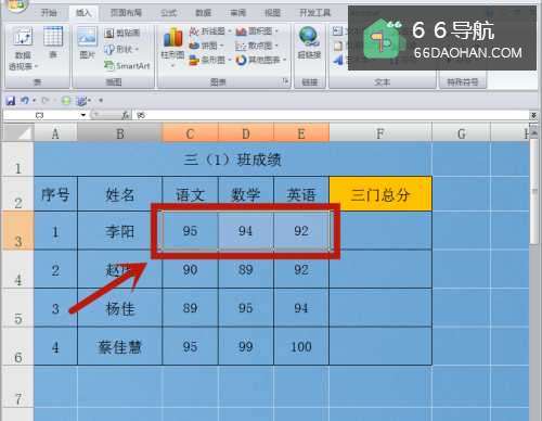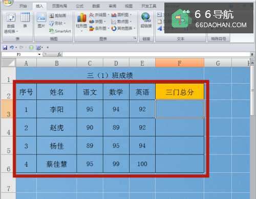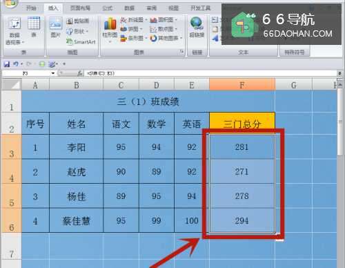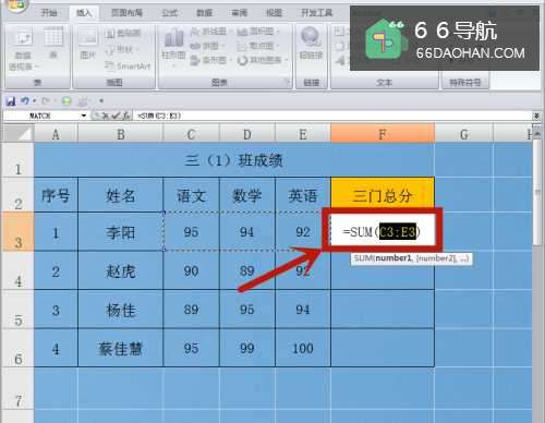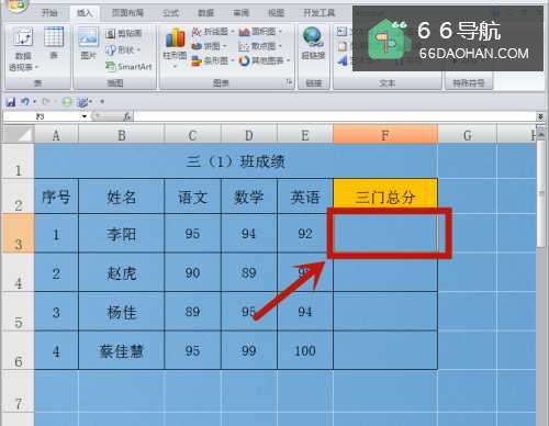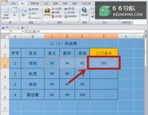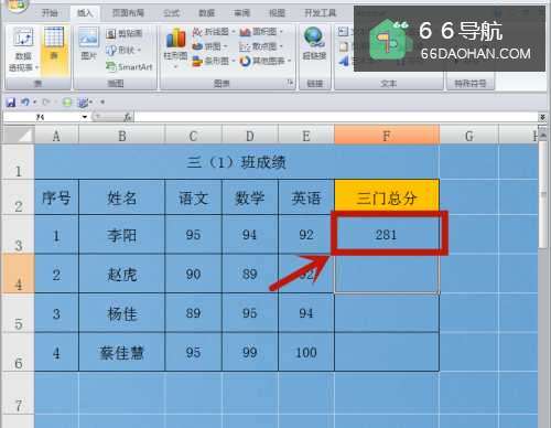 3求和计算成功,三门总分的结果出现在F3单元格。