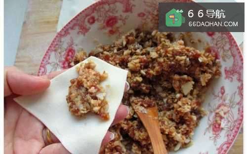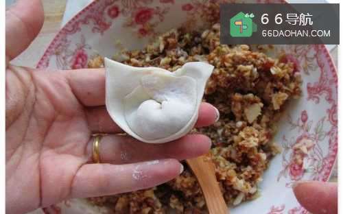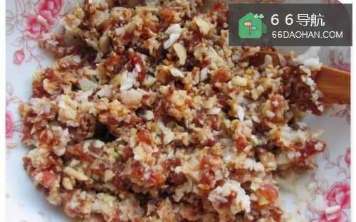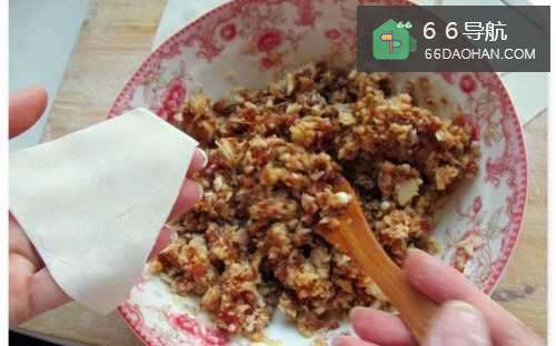 如图所示,把姜葱末倒到肉馅中,倒入酱油、盐。