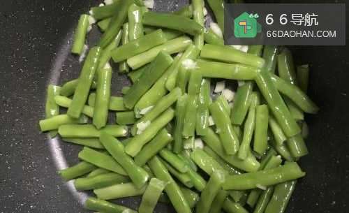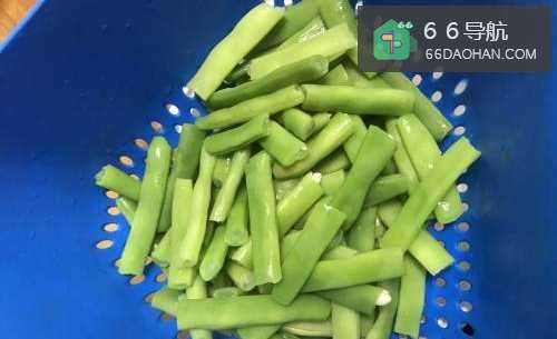 2把四季豆洗干净后折小段,在锅里焯水后捞起沥水。