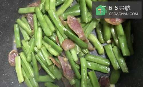 6加入香肠翻炒,放生抽和一点水翻炒一会。