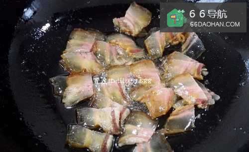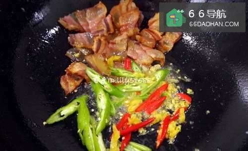 5接着在锅里放入腊肉,干炒出油来,一会用腊肉的油来炒辣椒特别香。
