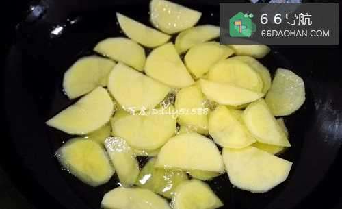 4油锅烧到七八成热的时候,放入土豆片,用小火慢慢炸至熟透,把土豆倒出来备用。