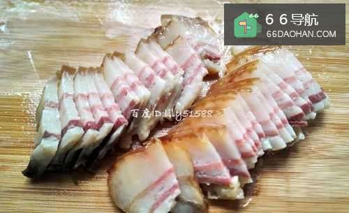 将腊肉洗干净,放入锅中用水里煮熟,拿出来晾干水份,切片备用。