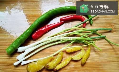 3准备好一个长青椒,两个红椒,六个泡椒,五条小葱洗干净备用。