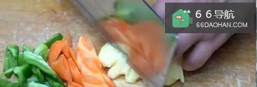 青椒、胡萝卜、菠萝分别切成滚刀块。