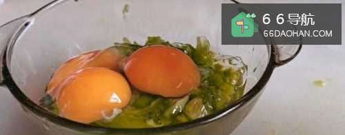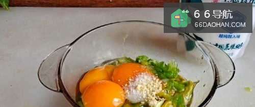 2接下来,把青椒放入碗中,接着打入三个鸡蛋。