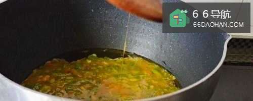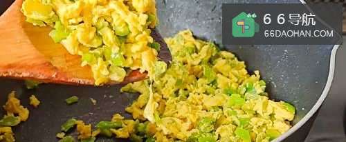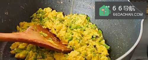 5然后,接着倒入青椒、蛋液,用小火翻炒;