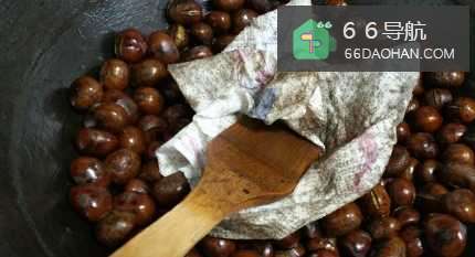 5如果怕吃的过程中脏手,这时可以放两三张厨房纸巾在锅里,用铲子压住纸巾搅拌栗子,这样可以把栗子表面的黑东西擦到纸巾上。