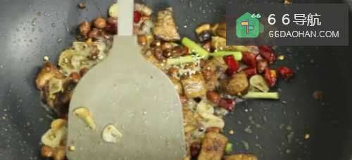 8加入姜片、蒜片、干辣椒、八角、花椒、炸过的花生米,不断翻炒