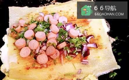 4第四步在没有鸡蛋的一面,放入适量的蒜蓉酱,撒上洋葱、香菜、烤肠和孜然。