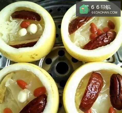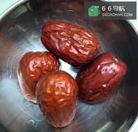 3把红枣,银耳切成小块,在梨中放入少许的冰糖,加入红枣和银耳;