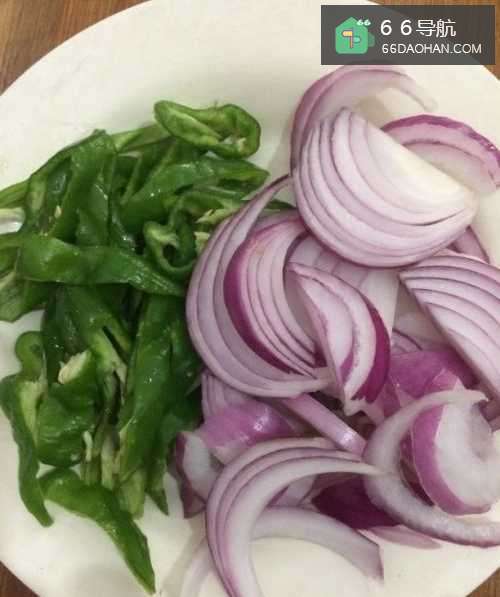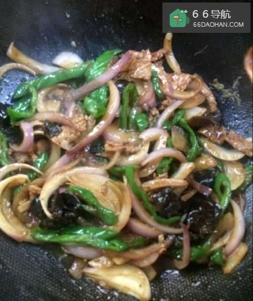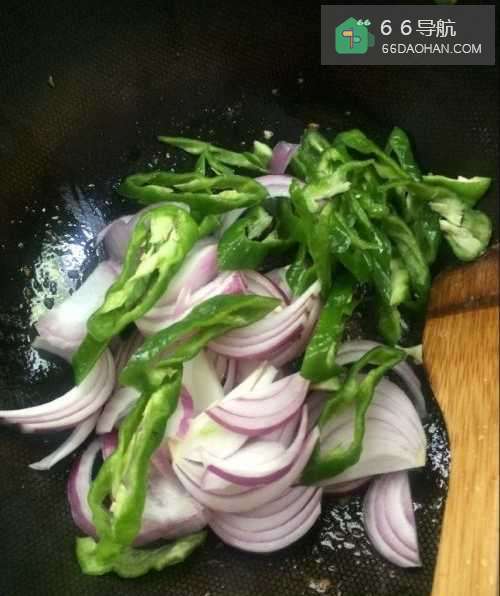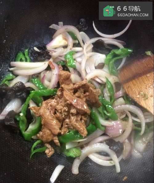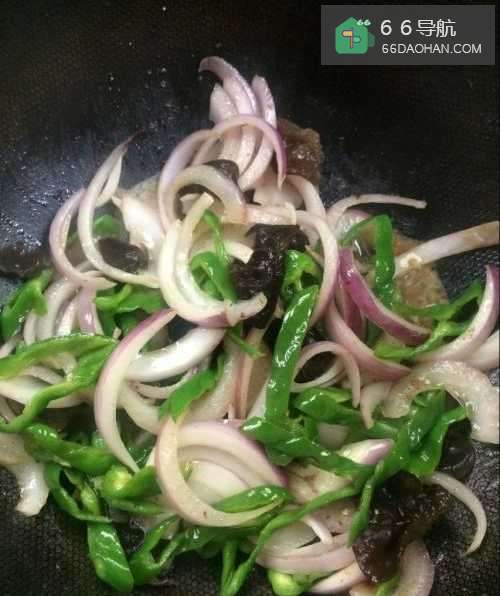 4锅里的余油烧热下洋葱青椒翻炒,加点点盐加木耳继续翻炒。