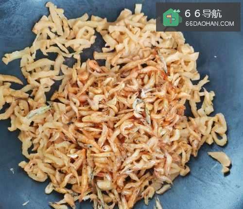 4等萝卜干的水分炒干后倒入虾米一起翻炒。