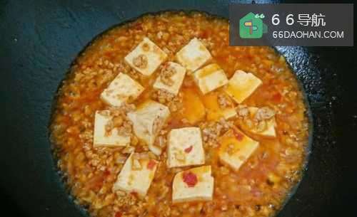 8倒入没过食材的清水或高汤煮开,把焯好的豆腐放下去煮两分钟。