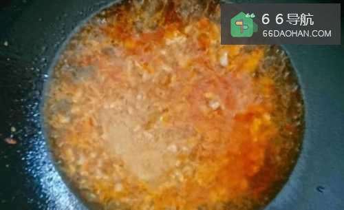 7放入葱姜蒜炒出香味来,倒1汤匙豆瓣酱炒出红油。