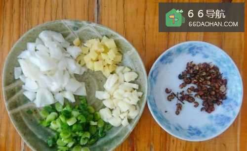 4将葱姜蒜切碎,准备一点花椒,再切一点青蒜备用。