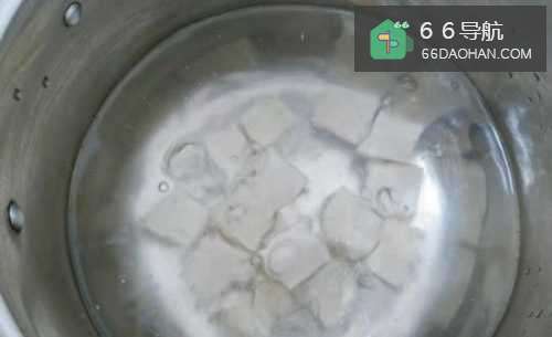 5锅中注水烧沸后,撒1小勺盐,把切好的豆腐放下去焯30秒,这样做一来可以去豆腐的豆腥味,二来可以方便定形,不会在烹煮的过程中一碰就碎。