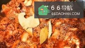锅内倒入啤酒淹过炒好的鹅肉,放入几片香叶,盖住锅盖中火焖煮